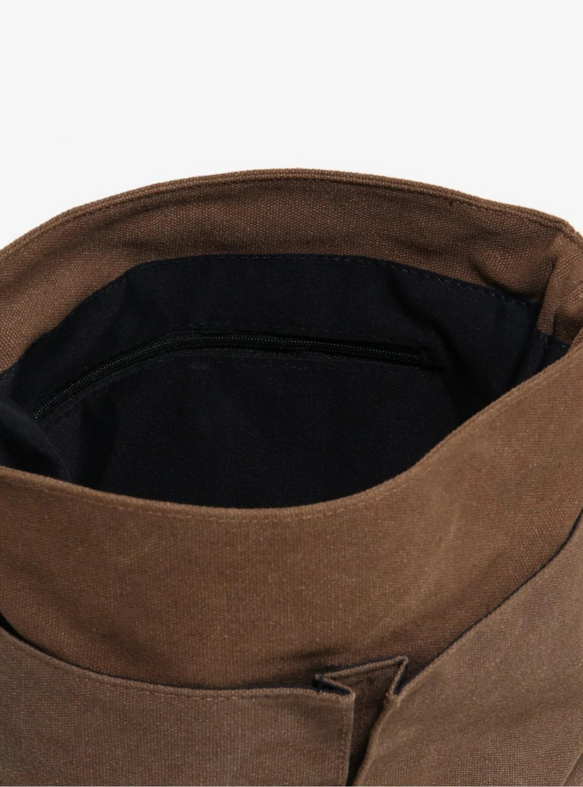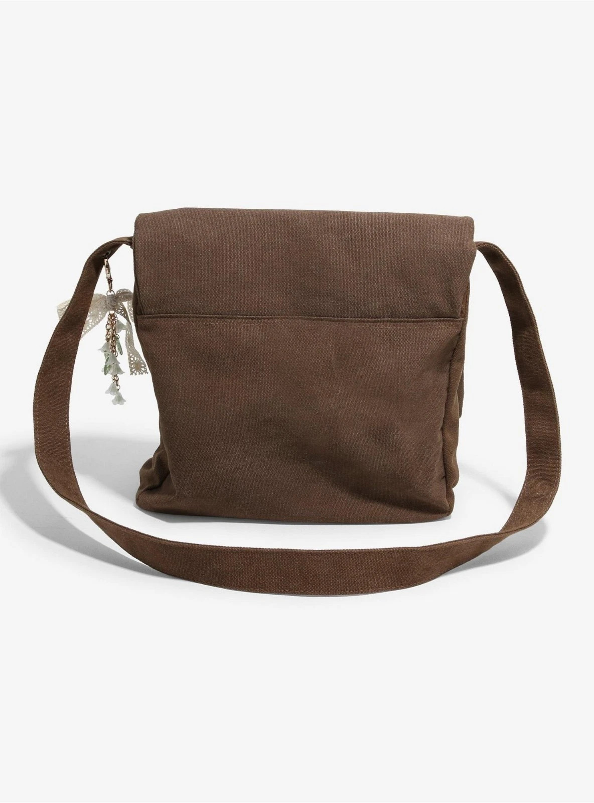The Black Butterfly Brown Canvas Messenger Bag by Hot Topic is a large rectangular bag with a brown canvas exterior and lining. It features a crossbody strap handle in brown canvas, a bag charm accessory, and a butterfly pattern theme. This stylish messenger bag is designed for women and is a perfect blend of functionality and fashion, making it a must-have accessory for any outfit.